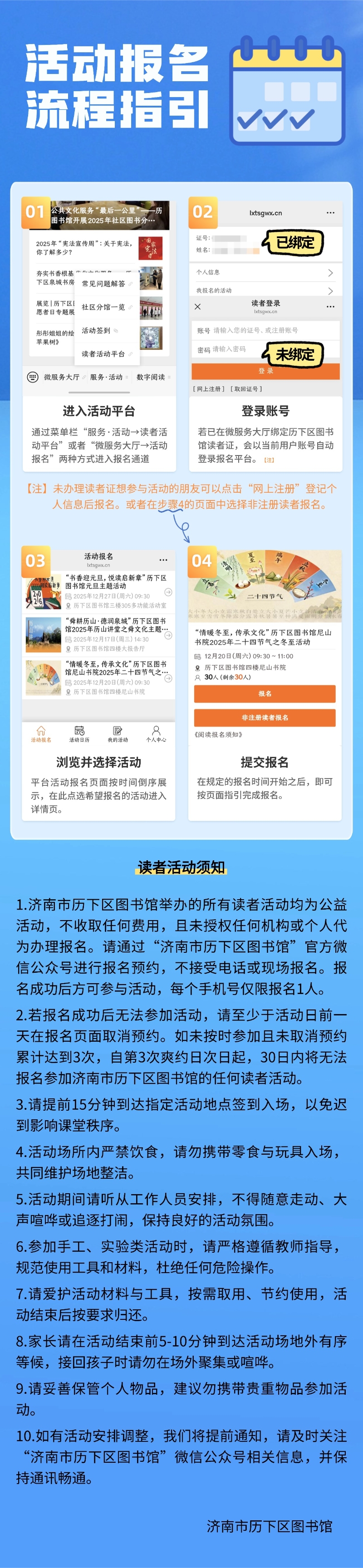 读者朋友们: 此前因系统优化、信息补充等,需要调整活动报名方式,历下区图书馆读者活动报名通道已完成更新升级并开启试运行。 新平台进一步完善了报名流程、信息填写项等优化,您可关注“济南市历下区图书馆”官方公众号,通过菜单栏“服务·活动→读者活动平台”或者“微服务大厅→活动报名”两种方式进入报名通道,按提示完成活动报名。 新一期读者活动报名开始时间为2025年12月16日上午9点,名额有限,先到先得,详情参见今日推文。 新平台相比以往变化较大,若报名过程中遇到系统问题,可公众号内私信,或拨打活动组咨询电话0531-81283202,或前往历下区图书馆服务台反馈,我们将及时为您协助解决。 济南市历下区图书馆 2025年12月 |
